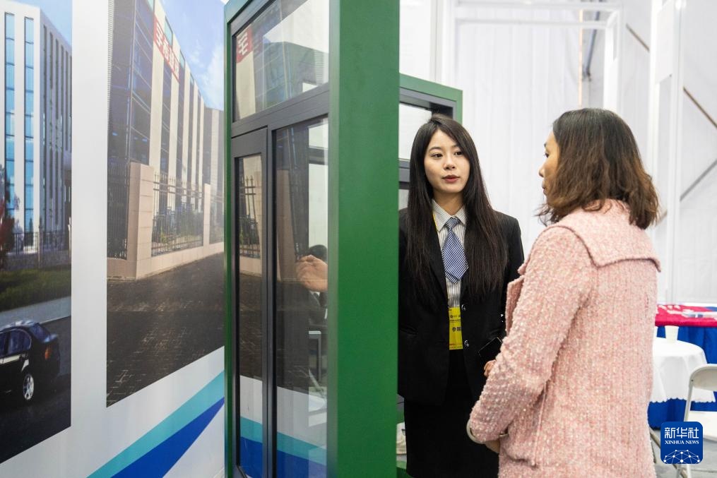 11月27日,在娄底经济开发区电力科技谷,参展企业(左)介绍复合门窗。 11月27日,湖南第三省