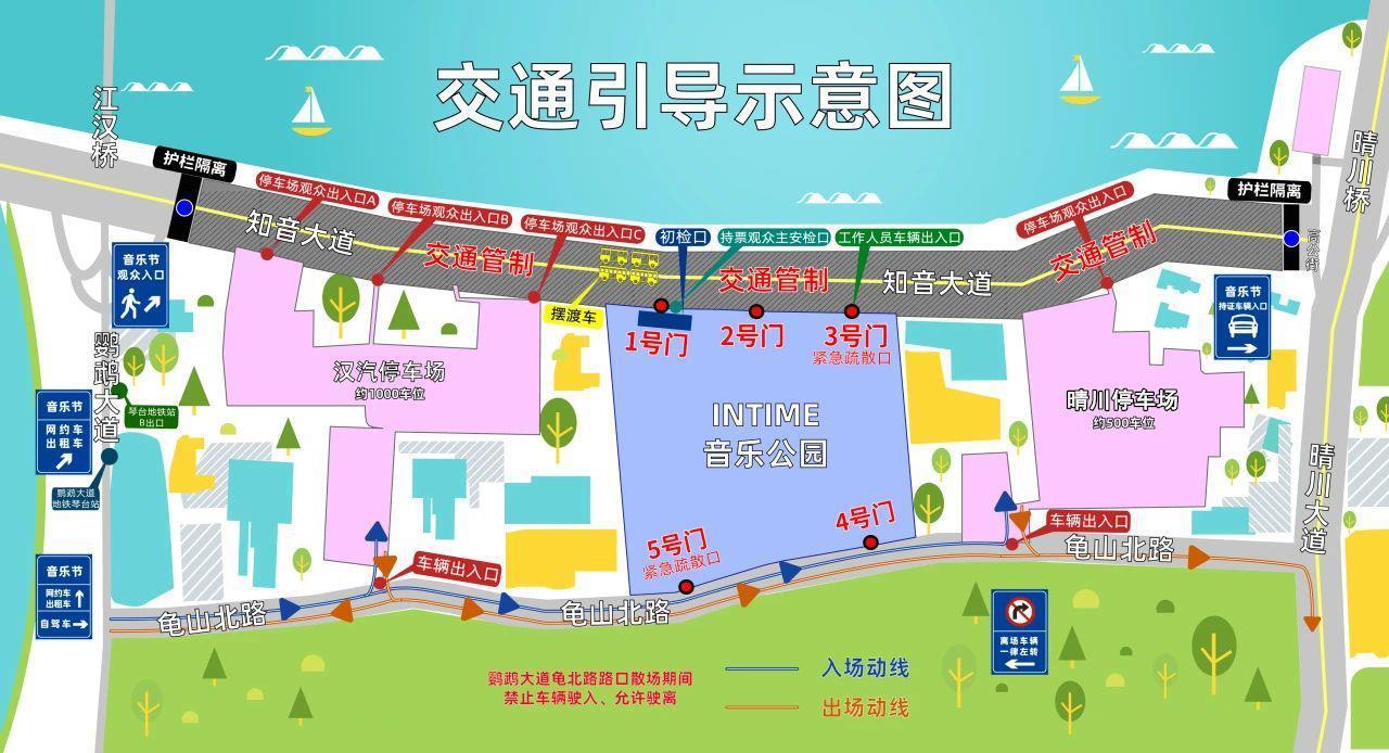 本周末,春浪音乐节将迎来20周年,并于11月8日至9日在武汉银泰音乐公园热情拉开帷幕。预计活动期间,音乐公园周边道路的人流量和车流量将大幅增加。为确保市民出行安全有序,武汉汉阳交警提前部署,发布以下出行温馨提示,帮助您便捷参与、安心享受音乐节。一、临时管控措施 1、11月8日、9日每天10:00起至活动结束,知音大道(高工街江汉大桥东翼路)禁止车辆通行、停车。 2、11月8日、9日每天10:00起至活动结束,知音大道(高工街至龙登路)、龟山北路、晴川大道(南岸嘴防洪墙段)禁止停车至汉阳大道)。 3、11月8日、9日20:00至活动结束期间龟山北路禁止机动车通行。 2、公共交通及地铁:市民可乘坐地铁6号线至“琴台站”B出口,出站后步行约18分钟即可到达。公共交通:市民可在“知银大道江汉桥”站乘坐公交车,下车步行10分钟即可到达;乘坐公交车至“Yoot Avenue琴台”站下车,步行19分钟即可到达;乘坐公交车至“晴川大道晴川阁”站下车,步行16分钟即可到达。出租车(网约车):市民可找到“知银大道江汉桥公交站”或“知银大道高工街”下车点,步行至现场。 3、驾车停车:自驾车可经余姚大道进入龟山北路,到达汉旗、晴川等停车场。活动结束后,车辆将被禁止进入龟山北路时,所有停车场出入口均仅限通行。车辆驶出停车场,经龟山北路东西两个方向离开现场。四、交通出行提示 音乐节期间,建议市民优先乘坐地铁、公交等公共交通,省心又环保。如确需驾车,请提前规划出行计划,关注实时交通状况,听从现场交警指挥,文明驾驶、规范停车。